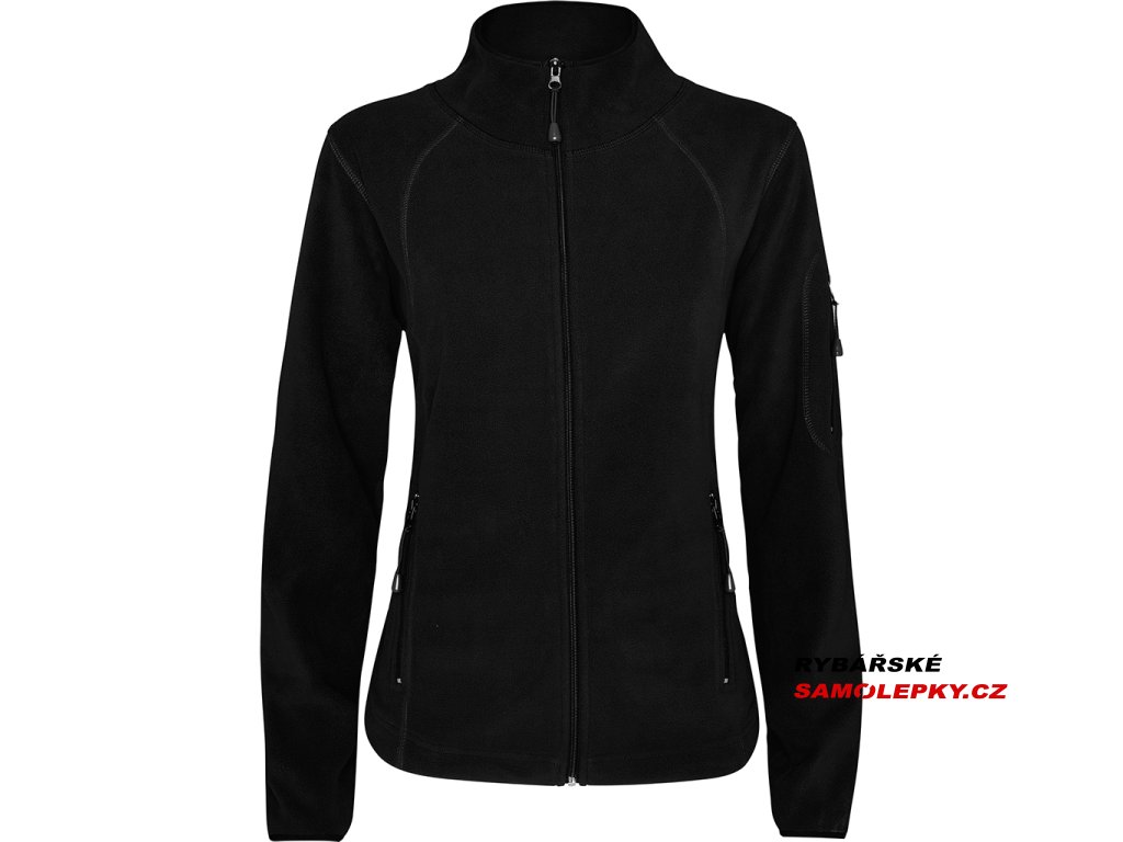 Dámská mikrofleecová sportovní bunda s vysokým límcem, dlouhým rukávem s lemováním v kontrastní barvě. Celolpropínací zip. Boční kapsa a kapsa na levém rukávu na zip. Prošívání na bočních stranách a na hrudi. Nášivka na lokti ze stejného materiálu.Doplňkové parametry