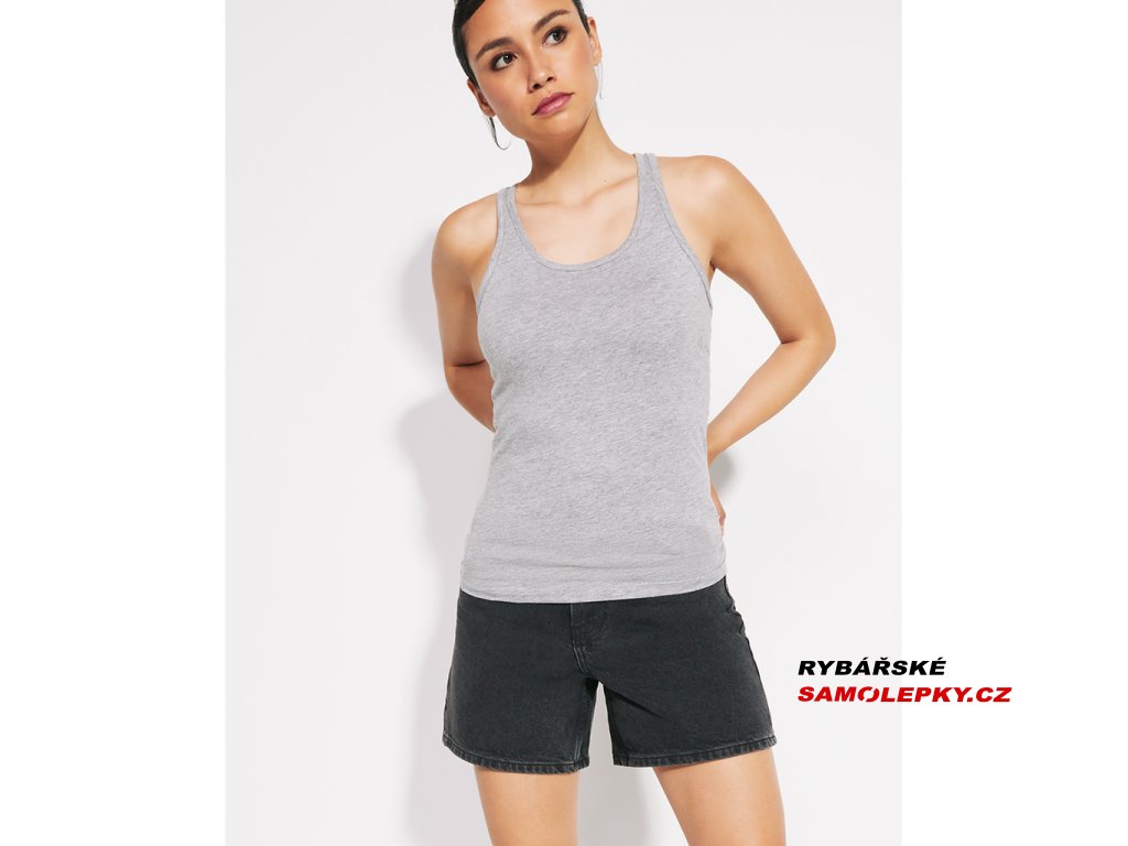 Přiléhavé dámské tílko s boxerskými ramínky z hladkého úpletu. Lemování výstřihu a ramínek z žebrovaného úpletu, boční švy. Barva 58 (melange) - složení 85% bavlna/15% polyester