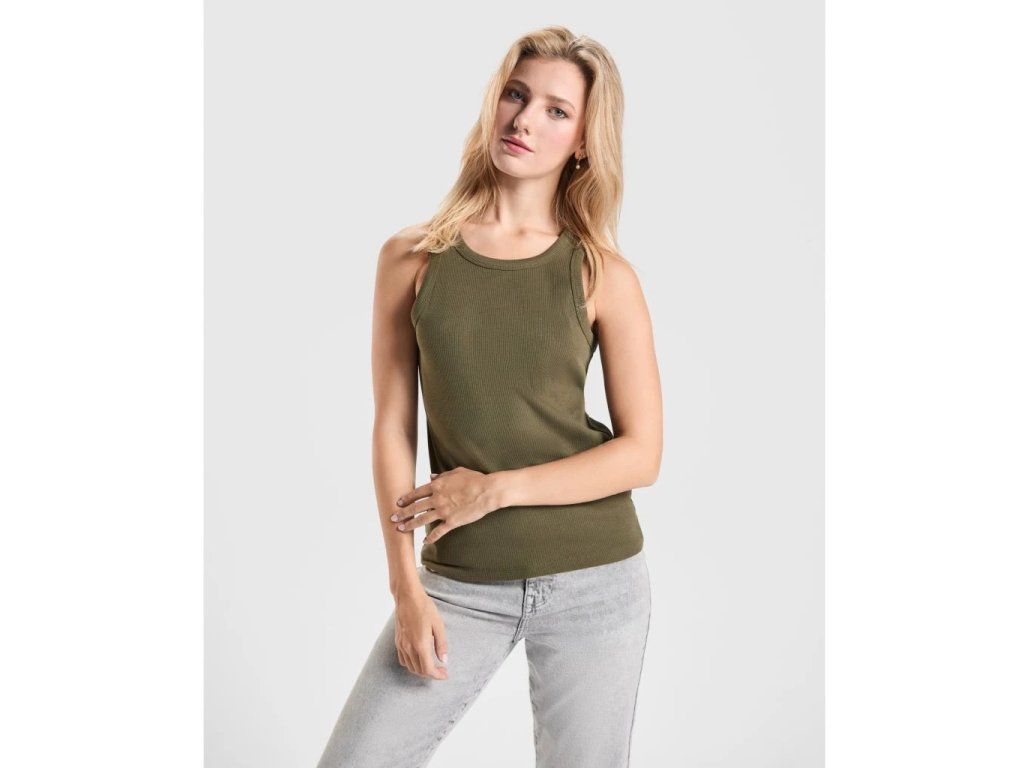 Dámské tričko z žebrovaného úpletu. Široký výstřih a průramky ze stejného materiálu a dvěma zesílenými švy. Dvojitě prošitý lem.Doplňkové parametry