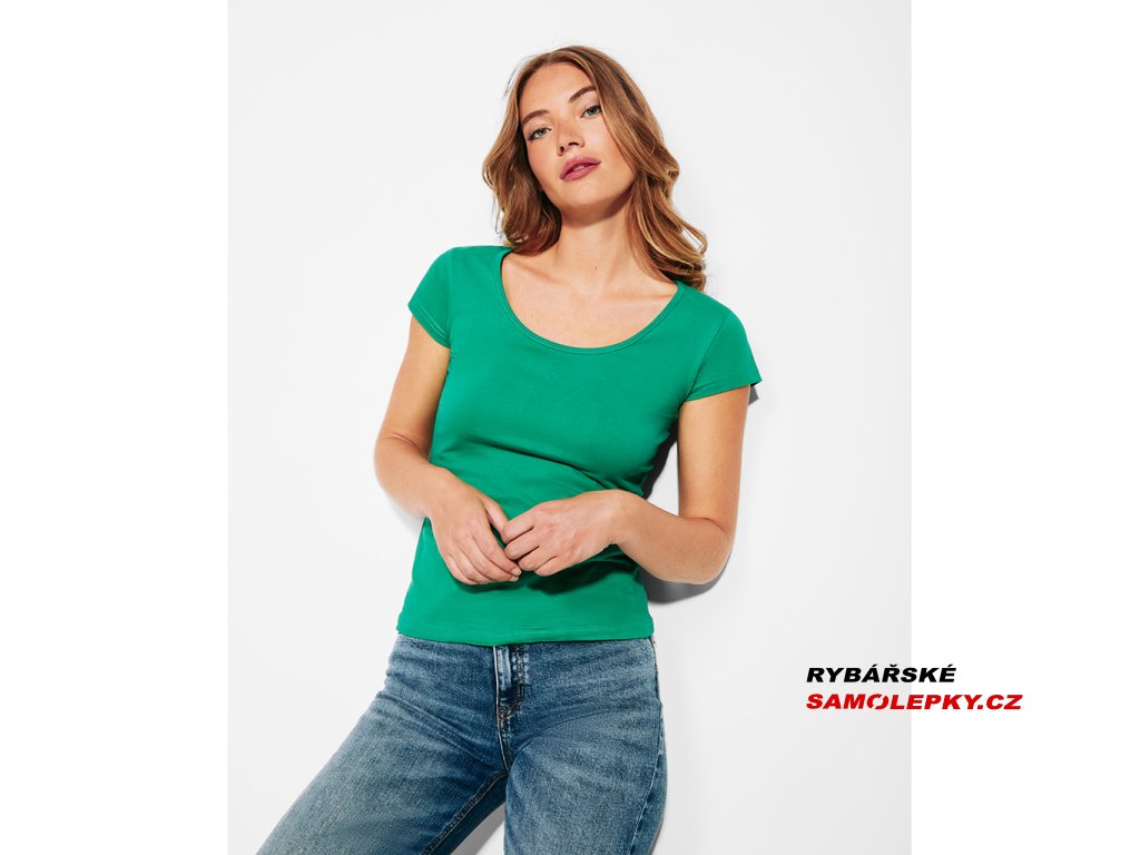 Dámské triko s krátkým rukávem a hlubokým kulatým průkrčníkem. Boční švy. Vypasovaný střih. Barva 58 (melange) - složení 85% bavlna/15% polyesterDoplňkové parametry