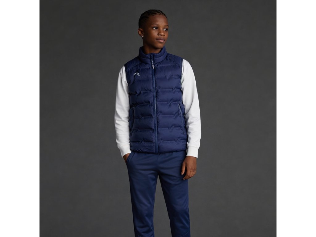 Dětská, lehká, polstrovaná sportovní vesta s výplní z materiálu, který na dotek připomíná peří, z tkaniny z recyklovaného polyesteru, polyamidu a s tepelně zataveným designem. Větru odolná.
