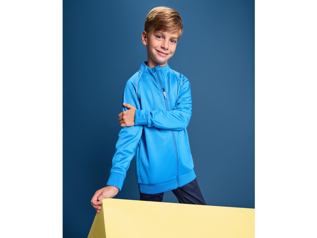 Sportovní mikina s vysokým krkem, raglánovými rukávy a zapínáním na zip na přední straně. Lem, límec a manžety s žebrováním 1x1. Páska u krku z hlavní tkaniny. Zadní díl u krku a manžety z hlavní tkaniny. Reflexní lemování na raglánových švech vpředu a vzadu.Doplňkové parametry