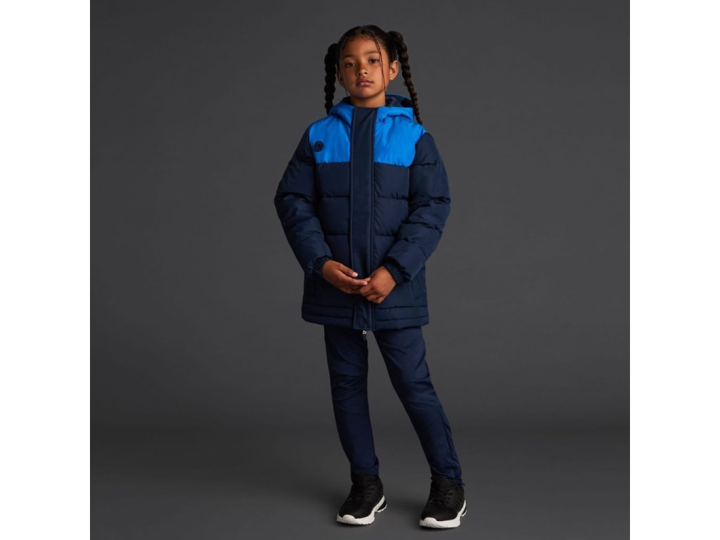 Dětská zimní prošívaná bunda s pevnou kapucí z tkaniny z recyklovaného polyesteru. Větru odolná.