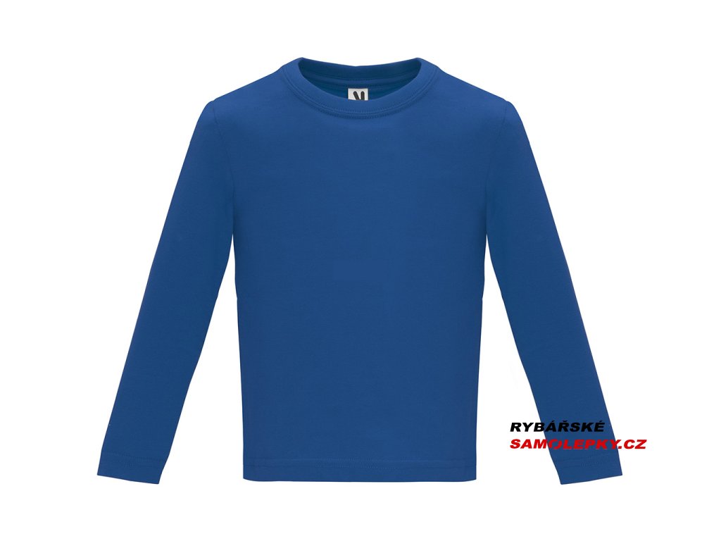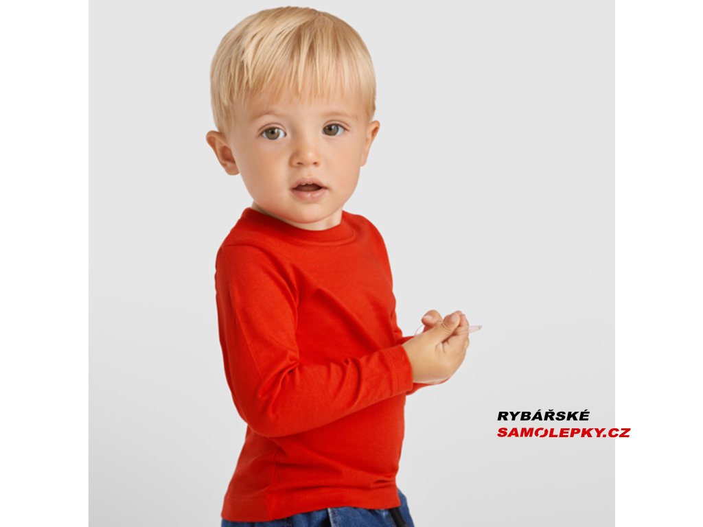 Bavlněné dětské tričko a dlouhým rukávem, kulatým průkrčníkem a bočními švy. Velikosti 6, 12 a 18 měsíců se zapínáním na rameni.