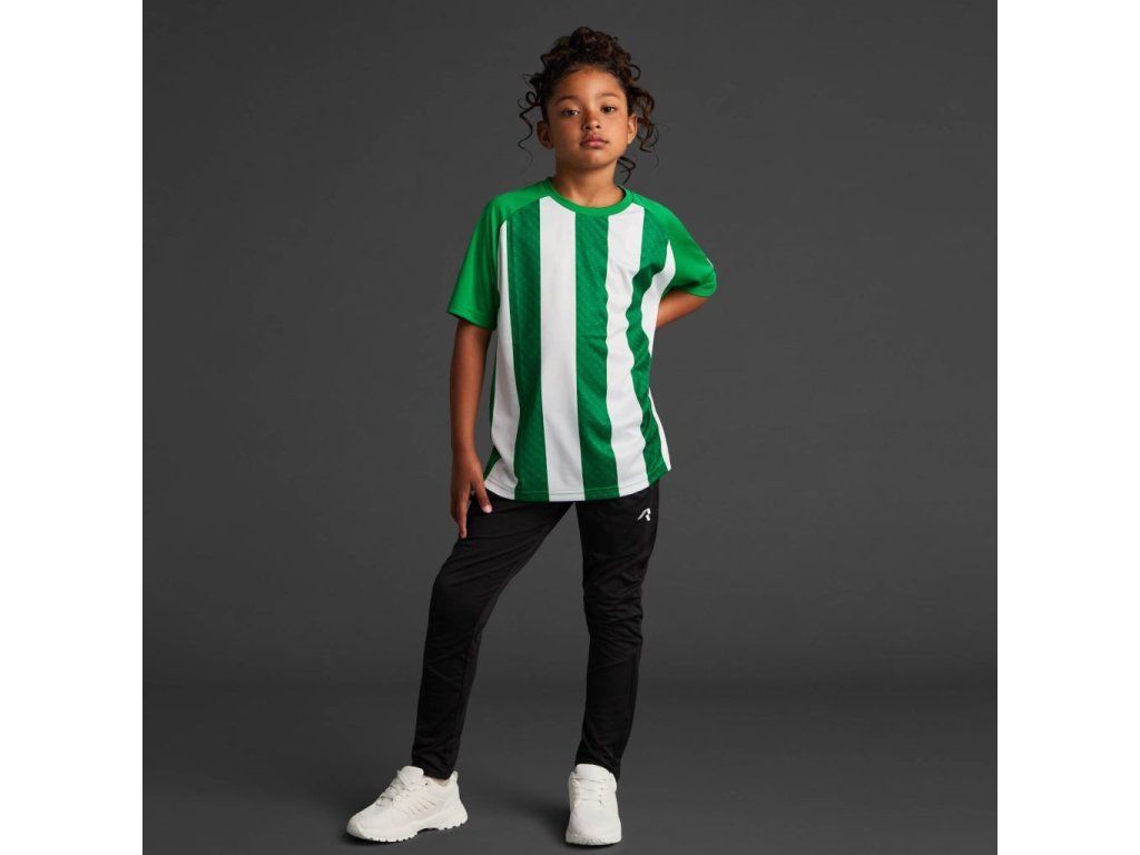 Raglánové dětské tričko s krátkým rukávem na fotbal z recyklovaného polyesteru. Design přední strany se sublimovaným potiskem a svislými pruhy.