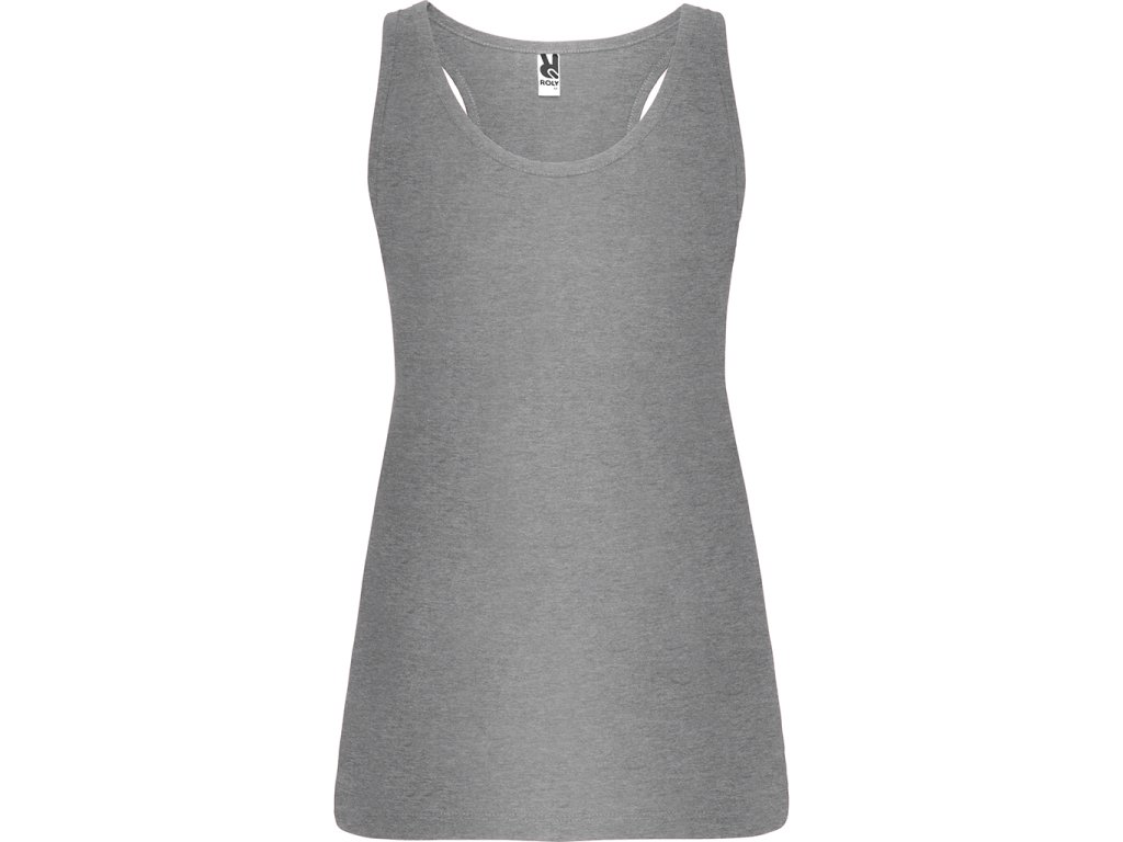 Přiléhavé dámské tílko s boxerskými ramínky z hladkého úpletu. Lemování výstřihu a ramínek z žebrovaného úpletu, boční švy. Barva 58 (melange) - složení 85% bavlna/15% polyester
