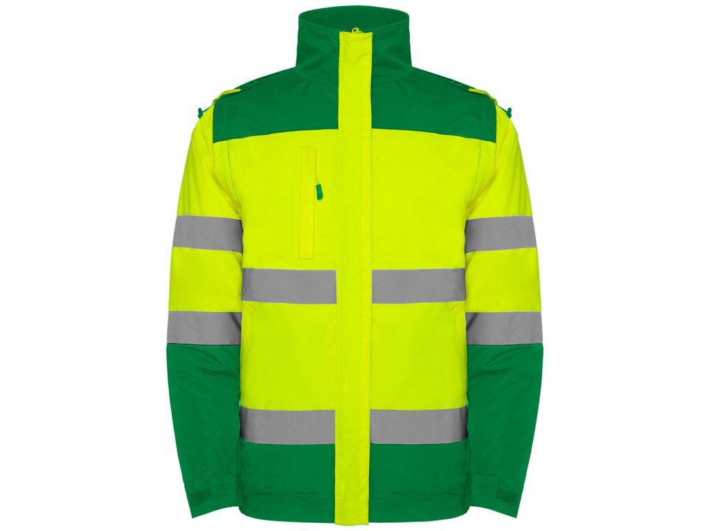 Kombinována dvoubarevná bunda s vysokou viditelností. S reflexními pruhy po celém těle a na rukávech. Kapuce s fluorescenčním lemem se zarážkami. Kapuci lze zabalit do límce. Náprsní kapsa na zip. Dvě mírně šikmé přední kapsy. Elastický spodní lem. Nastavitelné manžety na suchý zip. Reflexní celopropínací zip s klopou s přichycením na suchý zip. Vnitřní kapsa na hrudi a vnitřní zip pro snadný přístup na tisk nebo výšivku. Odnímatelné rukávy. Větru a voděodolný materiál. Vnitřní strana: 100% polyester. Podšívka: 100% polyester. Certifikace CE podle norem: EN ISO 13688:2013/A1:2021 a 20471:2013/A1:2017. Třída II.Doplňkové parametry