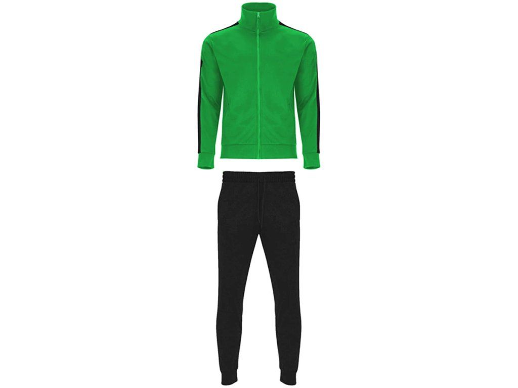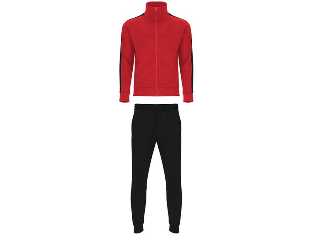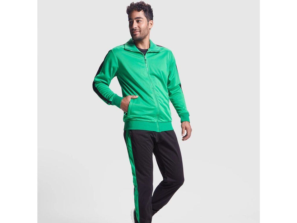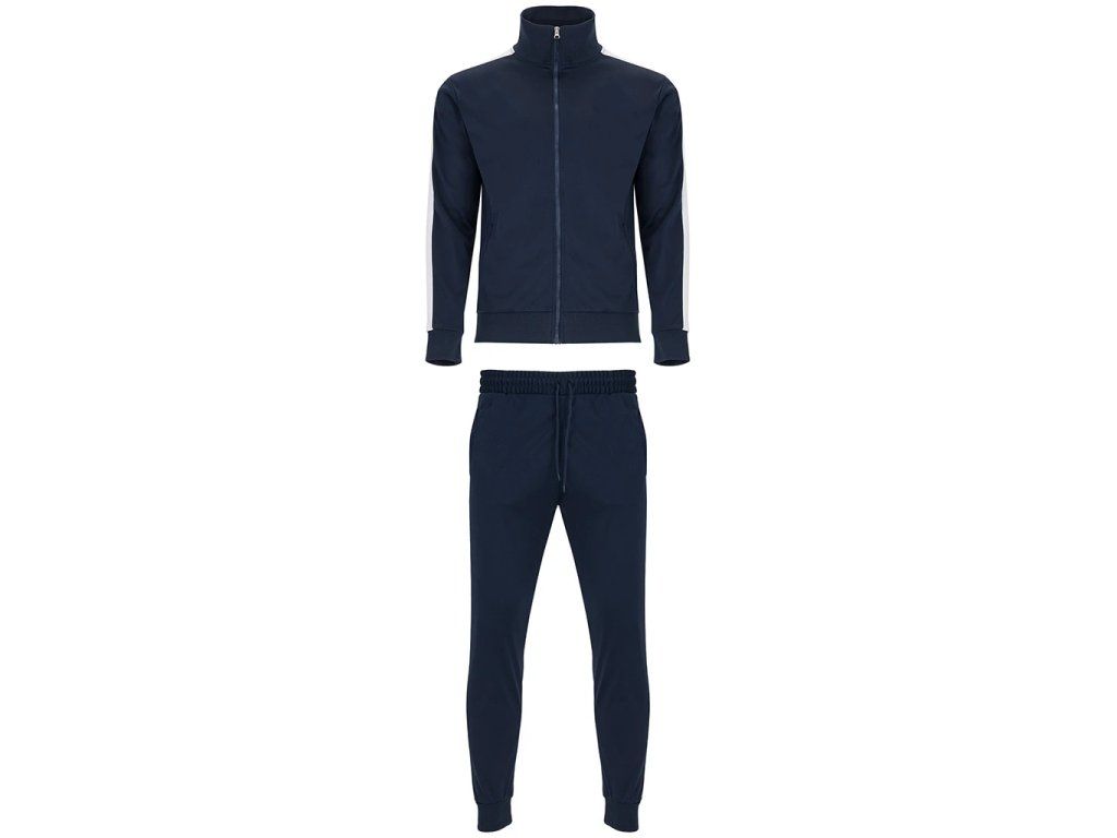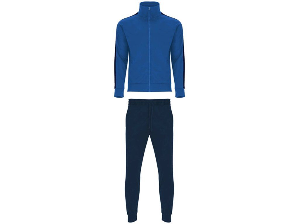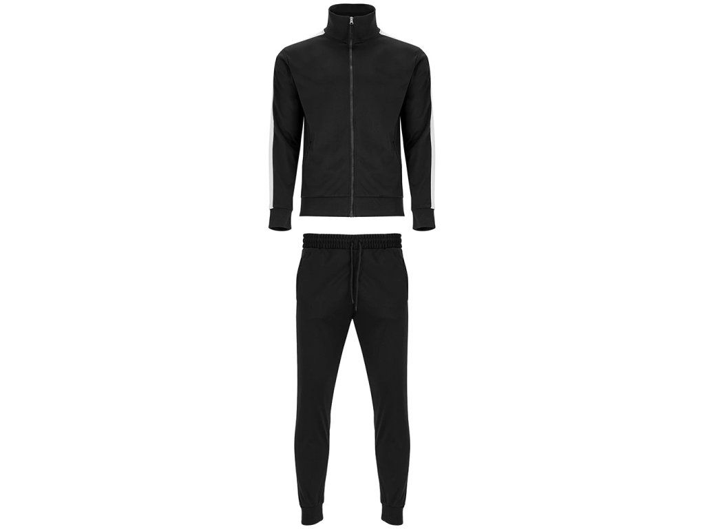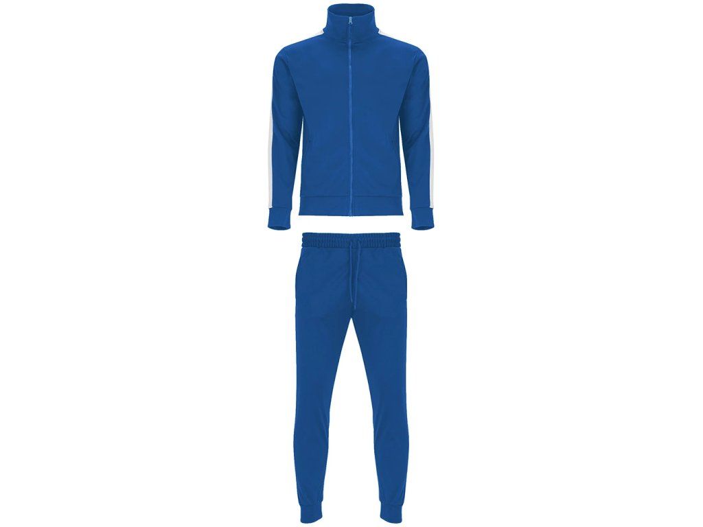 Klasická tepláková souprava z broušené tkaniny s kontrastními pruhy. Bunda s vysokým krkem a podlepeným výstřihem. Zapínání na zip na přední straně s taháčkem. Boční kapsy se zapínáním na zip ve velikostech pro dospělé. Výstřih, manžety a pas s žebrováním 1x1. Kalhoty s elastickým pasem a nastavitelnou šňůrkou. Boční kapsy a jedna zadní kapsa se zapínáním na zip. Boční panel v kontrastní barvě. Manžety s žebrováním 1x1.Doplňkové parametry