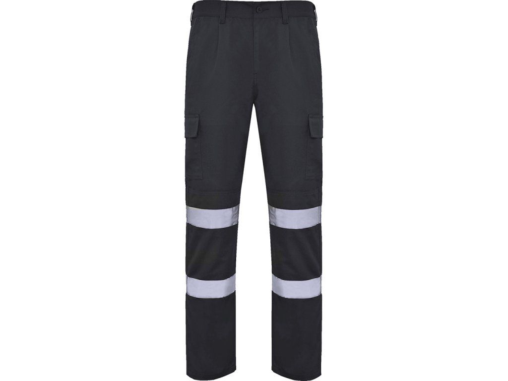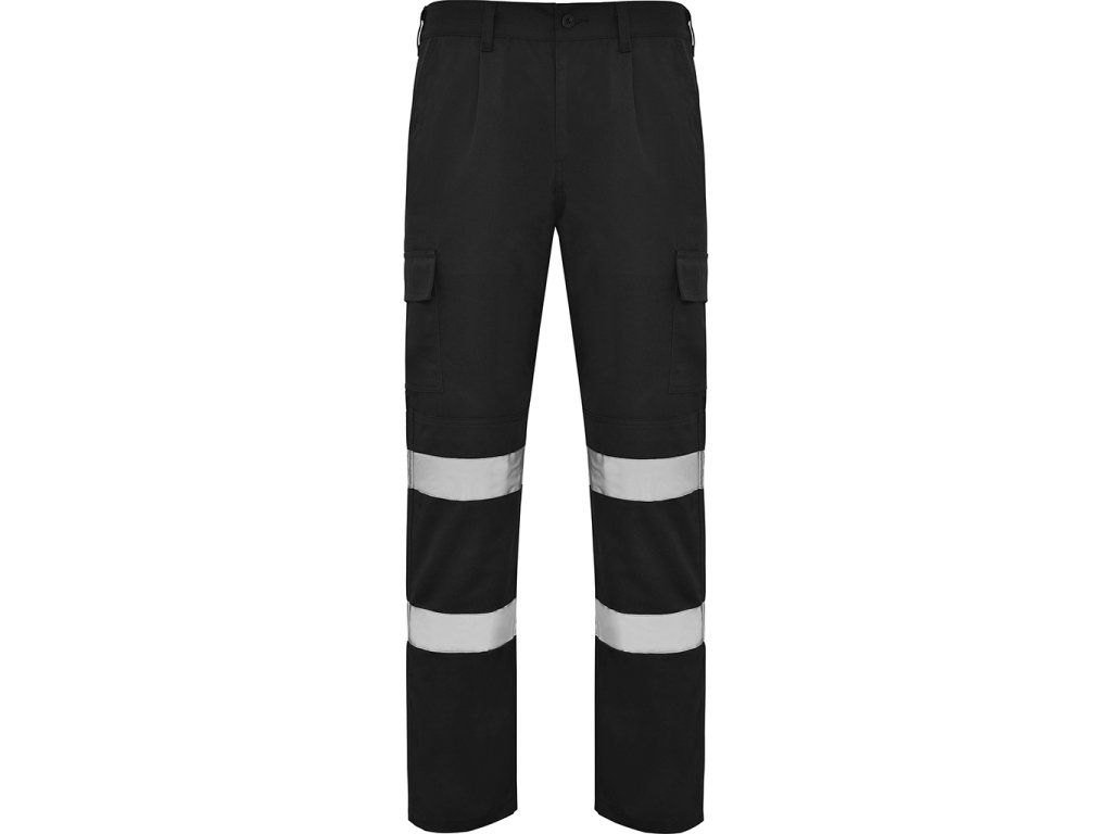 Pracovní kalhoty s vysokou viditelností z pevného materiálu. Elastický pás v zadní části. Dvě přední kapsy, funkční zadní kapsa a dvě boční kapsy s patkou a suchým zipem. Zesílený sed, dvojitý materiál na kolenou. Dva vodorovné reflexní pásy. Certifikace CE podle normy UNE-EN ISO 13688:2013/A1:2021 a EN 17353:2020. Třída B2.