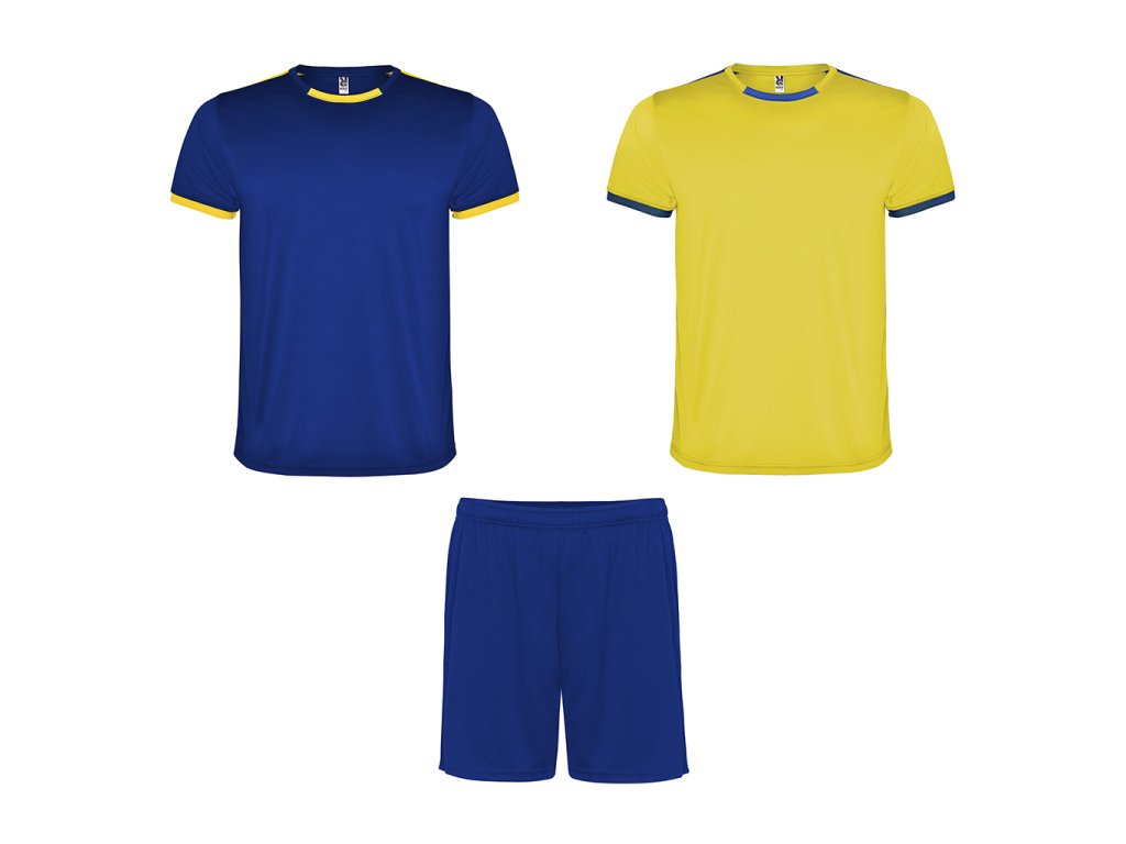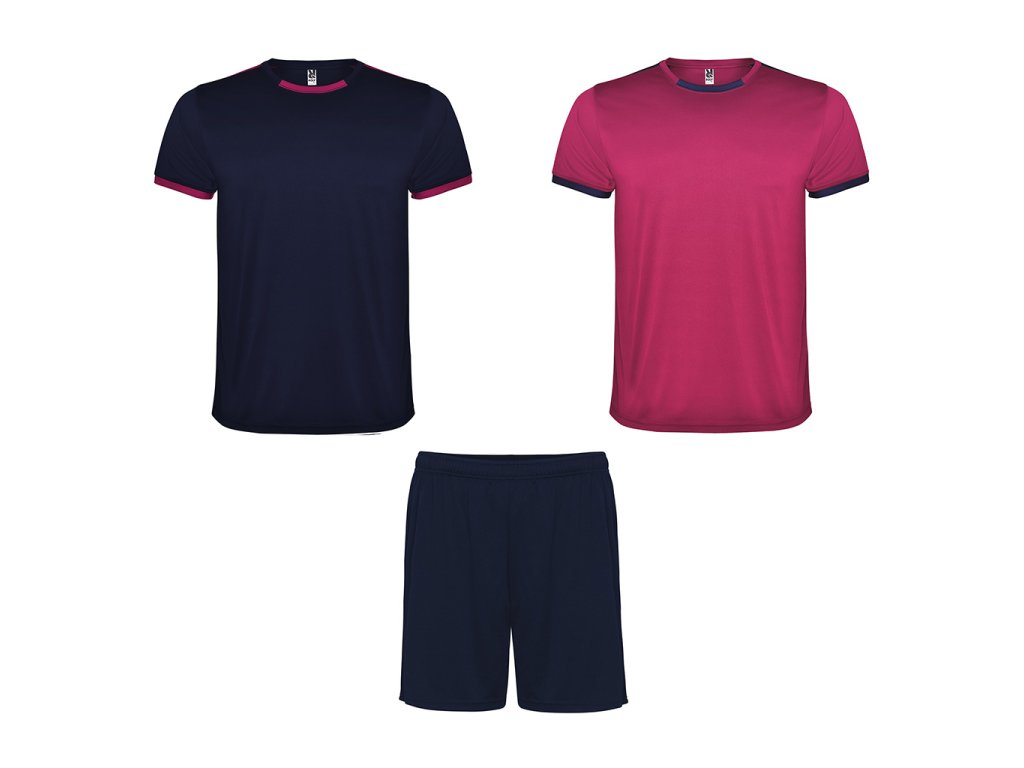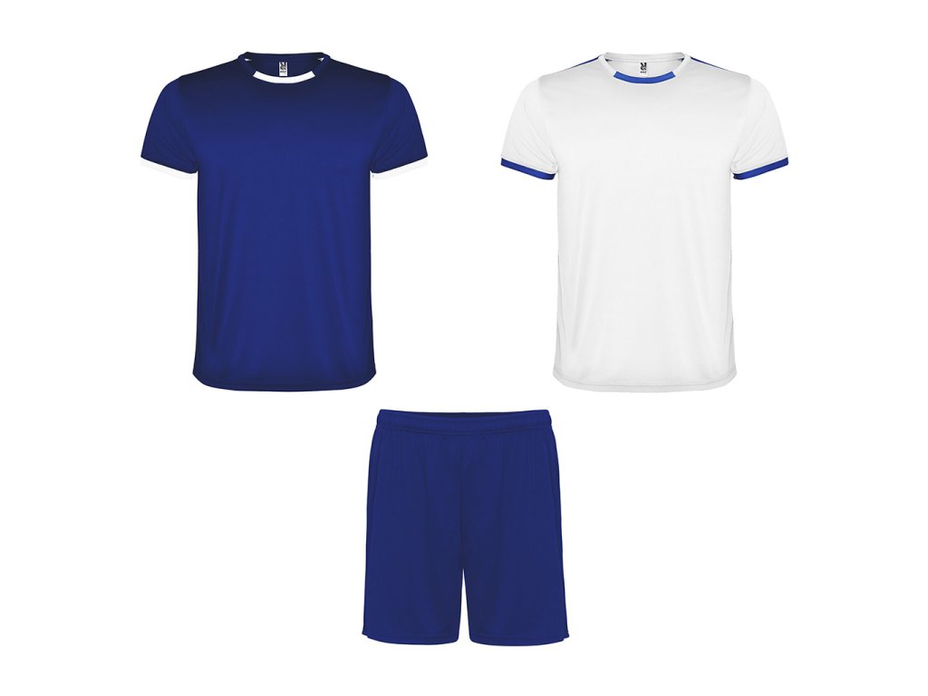 Sportovní unisex set, který obsahuje 2 trika a šortky. Krátké rukávy s kontrastním lemem. Kontrastní barva druhého trika. Dvoubarevný kulatý výstřih s pasovkou za krkem. Kalhoty s elastickou šňůrkou.Doplňkové parametry