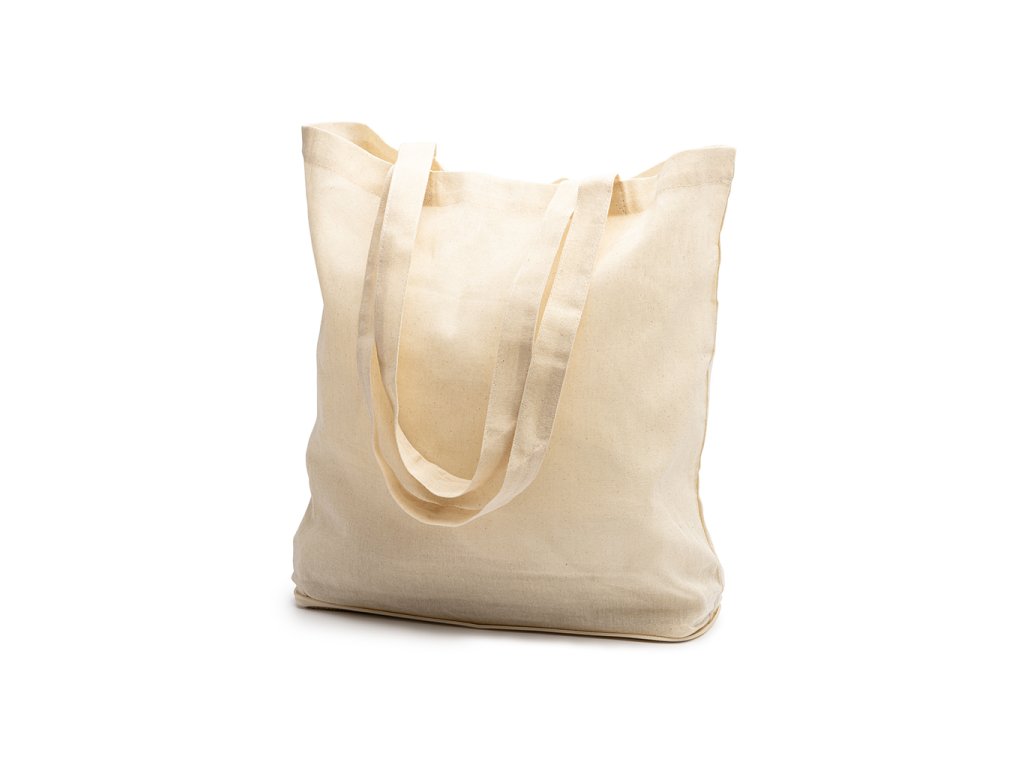 Skládací taška ze 100% bavlny (110 g/m²) se dnem z juty. Součástí je vnější kapsa. Zesílená ucha o délce 60 cm. Snadné skládání a zapínání na zip.Doplňkové parametry