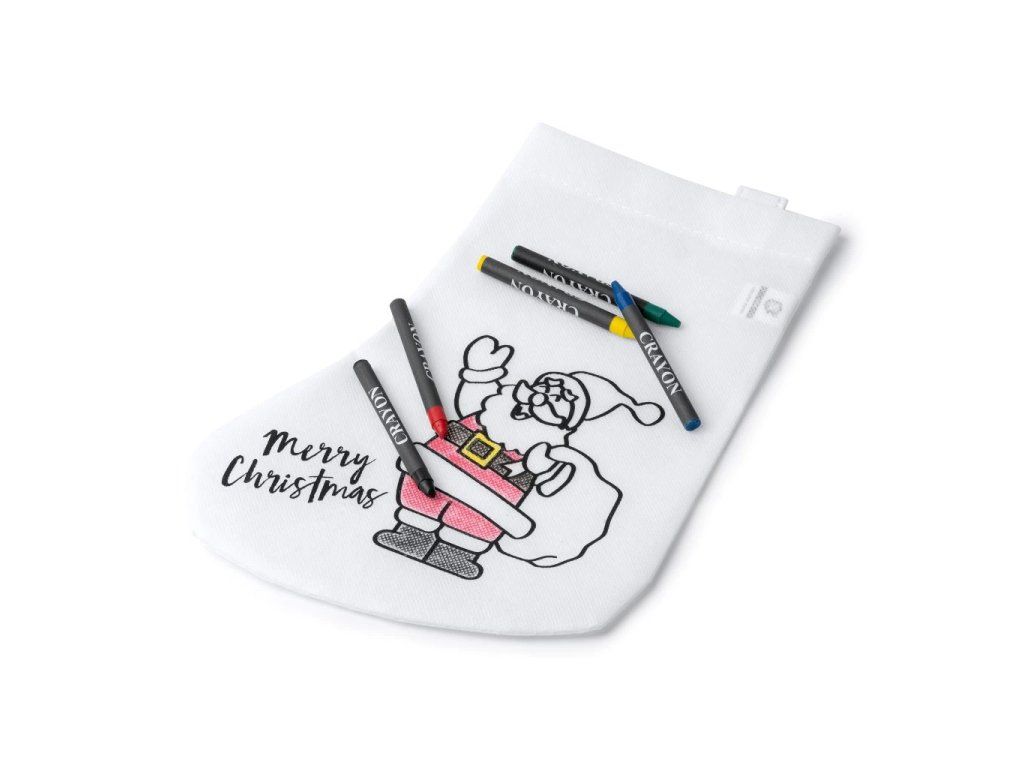 Vánoční punčocha s 5 různými pastelkami k vybarvování. Vyrobeno z netkané textilie o gramáži 80 g/m².Doplňkové parametry